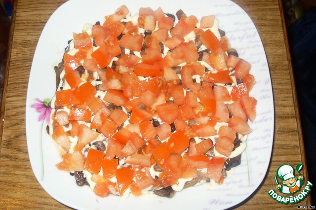 Третий слой: помидор небольшим кубиком + сеточка из майонеза (треть помидора оставить для украшения)