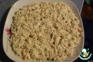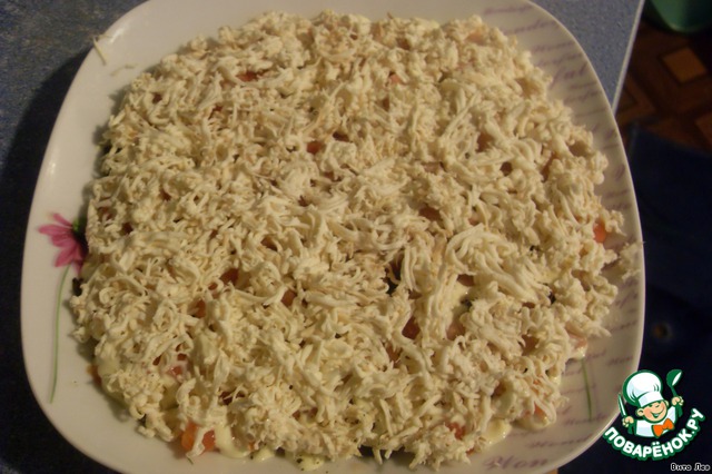 Четвертый слой: копченый сыр на мелкой терке + сеточка из майонеза