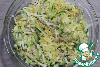 Итак: Отварное куриное мясо разделяем на кусочки, выкладываем на блюдо. Делаем сеточку майонезом (его много не нужно, салат достаточно сочный) и слегка перчим. Кстати, в этом салате копченым может быть либо сыр, либо куриное мясо. -