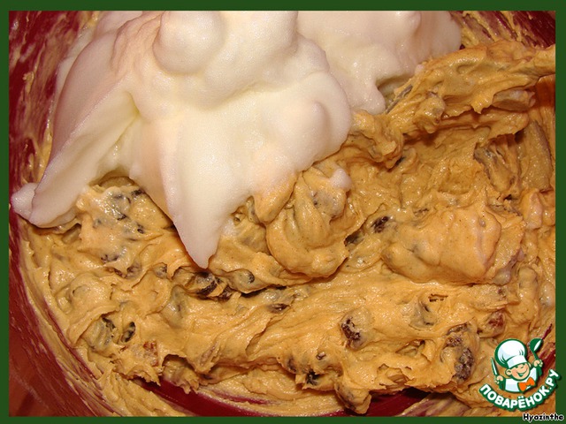 Белки взбиваем с щепоткой соли до "пиков" и добавляем в тесто: сначала 1/3 тщательно вмешиваем в тесто, потом оставшиеся белки аккуратно движениями снизу-вверх, однородности теста добиваться не надо).