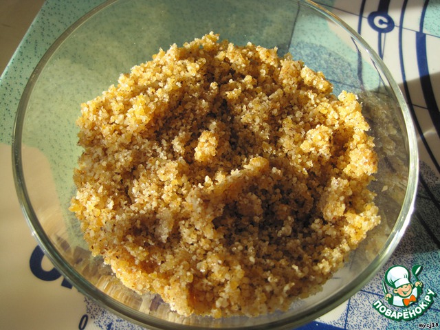 • Пока тесто подходит, делаем начинку. Для этого измельчаем в комбайне курагу и грецкие орехи, добавляем сахарный песок.
