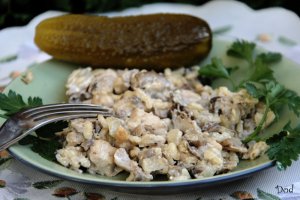 Нарезать лук, куриное филе. Разогреть масло, обжарить курицу, лук и грибы до полуготовности.