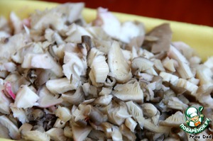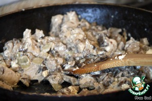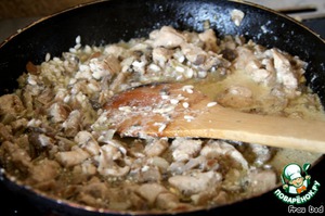 Нарезать лук, куриное филе. Разогреть масло, обжарить курицу, лук и грибы до полуготовности.