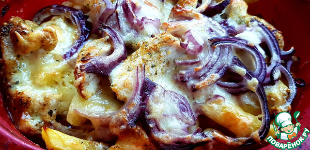 Чистим, моем картофель, режем как на "фри". Укладываем на сухой противень или форму для запекания. Режем свинину полосками соизмеримыми с полосками картофеля. Укладываем свинину сверху картофеля. Режем лук полукольцами, укладываем сверху мяса. Далее солим, по желанию добавляем любимую приправу. Разводим тeплой водой майонез в пропорции 1 :1.