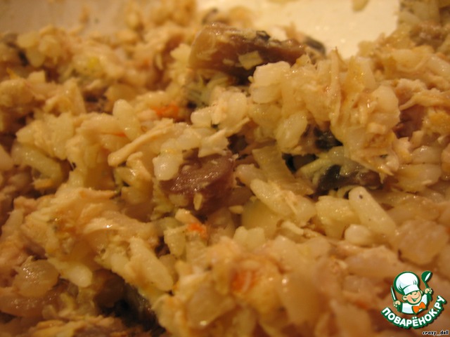 Отваренную или (как у меня) тушеную курочку (у меня была грудка) нарезаем очень мелко, смешиваем с вареным рисом. Отдельно обжариваем лук с грибами, добавляем к рису и курочке. Посолить нужно по вкусу, я солила отдельно рис - при варке, грибы - при жарке и курочку - при тушении, поэтому начинку досаливать не пришлось. -