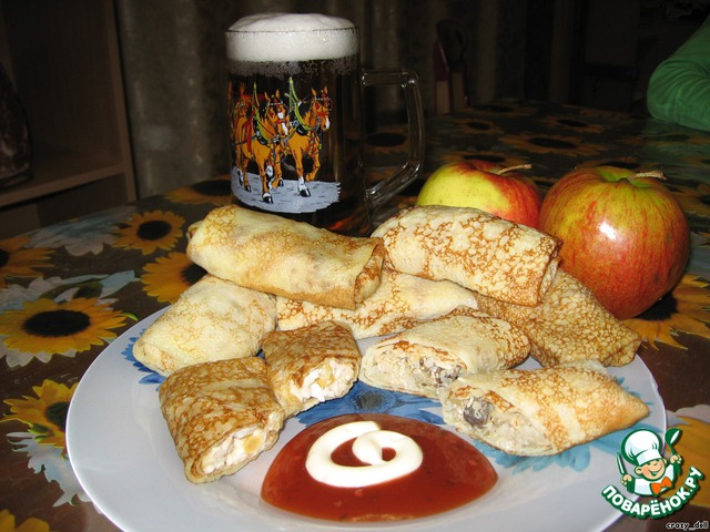 Начинку завернуть в блинчики, при подаче я немного разогреваю в микроволновке.