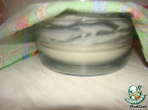 4. Накрыть полотенцем. Налить в миску теплую воду, опустить емкость с тестом. -