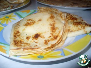 Сначала выпекаем тонкие блинчики большого диаметра. По любому рецепту.