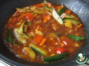 Обжариваем овощи и ананас. Готовим на большом огне, постоянно помешивая, пару минут.
