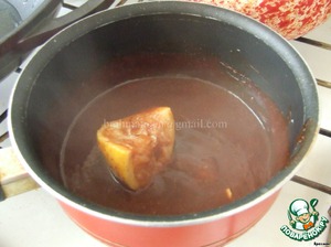 Теперь занимаемся соусом. Смешиваем в сотейнике все ингредиенты и сгущаем, не доводя до кипения. Когда чуть загустеет, выдавливаем половину лимона. Кладем сам выжатый лимон.