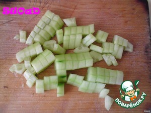 Огурец очистить от кожицы и порезать кубиками.
