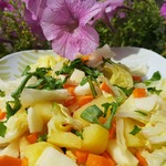 Всё смешать в миске и заправить по вкусу или майонезом или оливковым маслом. Я посыпала сверху сухариками, но до стола они не дожили, их выбрали первыми.