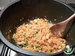Разогреем казанчик и положим туда все порезанные овощи сразу. Обжарим.
