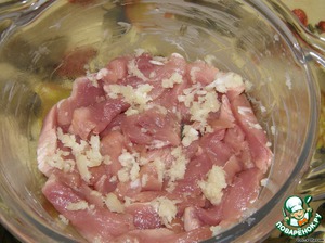 Режем мясо средними кусочками, выдавливаем чеснок.