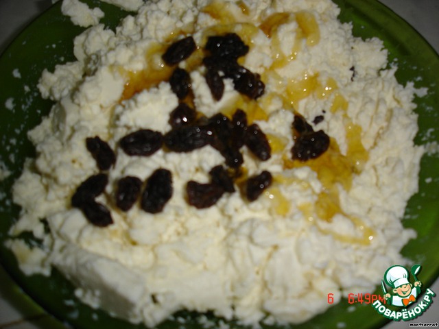 Приготовить творожную массу: творог растереть с сахаром, добавить размоченный изюм, ваниль, мед, размешать