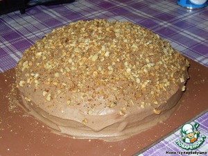 Заварной крем сварить по инструкции на пакете с 300 мл молока. Остудить. Масло взбить, добавить какао, полбанки сгущенки и заварной крем и все снова хорошо взбить миксером. Обмазать весь пирог. Сверху посыпать измельченными орехами.