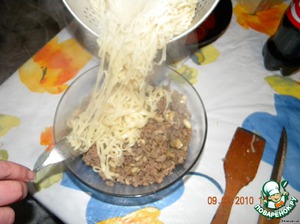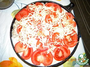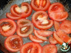 Отварить лапшу - согласно инструкции. Обжарить фарш с лучком. Отдельно грибы. Всё посолить. Смазать форму. Выкладываем помидоры, немного подсолить.