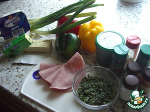 Нарезать ветчину кубиками, лук тонкими колечками, паприку кусочками и добавить в творожную массу, все перемешать. Затем укроп, остальные травки соль, перец.