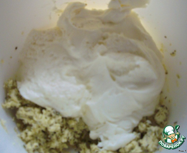 Взбить сливочное масло с приправами, добавить творог, перемешать до однородной массы.