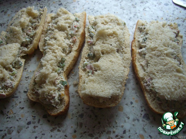 Разрезать багет сначала поперек, а затем вдоль. Вынуть мякиш, желательно одной полоской, но, если не получится, тоже не страшно, в серединке не будет видно. Затем выкладываем массу на все 4 половинки. Hа каждую в середину кладем полоску мякиша и накрываем другой половинкой.