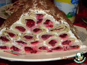 Если вишня у вас замороженная-разморозить. На 600 г 0,75ст.сахара и 4 ст.л воды проварить минут 10 оставить на час или на ночь. Слить жидкость. Берём блин, выкладываем на него вишню.
