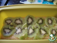 И сверху выкладываем нарезанные фрукты. У нас вот были киви. (На заметку: в след. раз возьму фрукты поярче и поцветнее, чтобы слои различались получше). |
