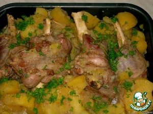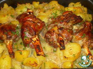 Выкладываем на блюдо, гарнируем маринованными овощами, лимоном, зеленью. Запах стоит..! Даже картошка получается настолько вкусная, что забота о фигуре уходит... и возвращается только утром. А мужчины неизменно в восторге от этого мяса, тем более большинство из них, обожают обгрызать кости. ПРИЯТНОГО ВСЕМ АППЕТИТА!