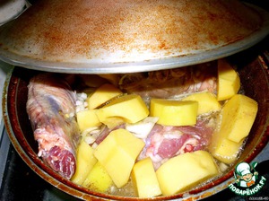 Баранину (у меня ножки), положить в казан или глубокую сковороду смазанную маслом. Если куски крупные, как у меня, то налить на дно воды и тушить мясо под крышкой 30 мин. А если куски не большие, то сначала режем лук не крупно.