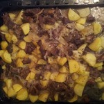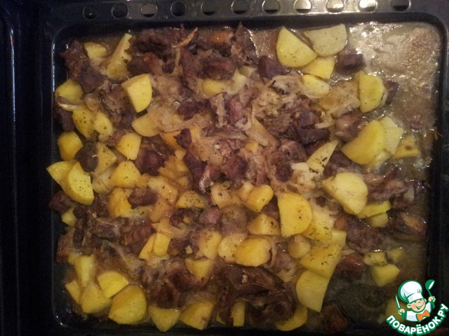 В это время разогреваем духовку до 180-200гр. Перекладываем мясо с картошкой на противень.