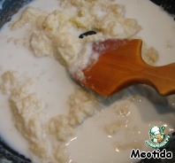 постепенно вливаем молоко, разбивая лопаточкой комочки
