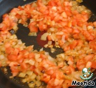 помидор обдаем кипятком, снимаем с него шкурку, нарезаем мелкими кубиками и отправляем к лучку