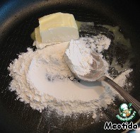 на раскаленную сковородку кладем масло и муку, готовим, помешивая, пока масло не растворится -
