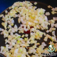 чистим лук, мелко нарезаем и обжариваем в небольшом количестве растительного масла -