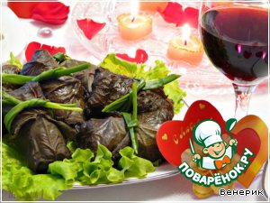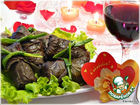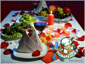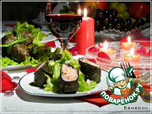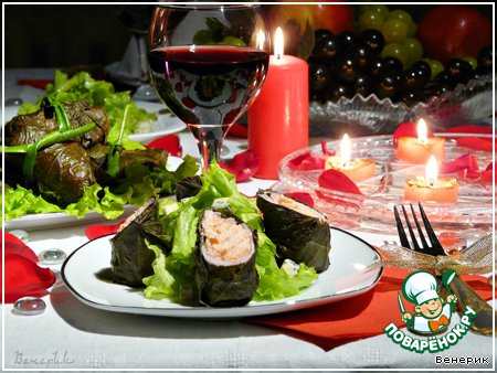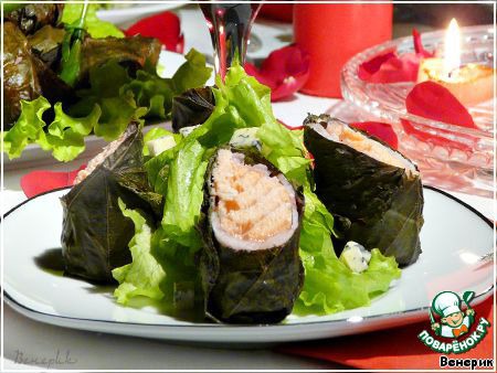 Богиня Любви – Афродита – появилась на свет из морской пены, а вместе с ней родились розы… Такое красивое предание, я попыталась символично представить на моeм столе в виде многочисленных лепестков роз... Ужин тет-а-тет, не смотря на изысканность и торжественность, не должен быть чересчур обильным. Ведь романтический ужин - это не праздник живота, а некая прелюдия для двоих, помогающая расслабиться и забыть о повседневной суете и проблемах. И поэтому я решила приготовить такое лeгкое, вкусное и необычное блюдо... Рыбка получилась нежнейшая и сочная, благодаря соусу, в котором она мариновалась, а бекон придал пикантность и подкопченность сeмге. Это блюдо лучше всего подавать со свежим зелeным салатом, и бокалом красного вина. Виноградные улитки из сeмги готовятся за какие-то полчаса, что немаловажно))) Ведь Вы не должны быть в этот день как "выжатый лимон", и ещe у Вас должно остаться время, для того, чтобы привести себя в порядок))) На конкурс "Подари мне этот вечер".
