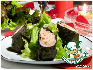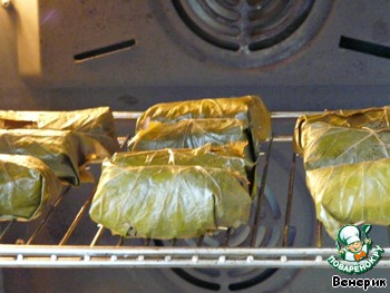 Затем, завернуть в виноградный лист, и закрепить шпажками (после запекания шпажки легко вытаскиваются и рулетики не теряют форму)