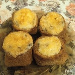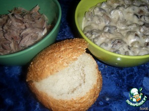 Итак, срезаем не до конца крышечку, выбираем мякиш, дно прижимаем пальцами и начиняем наши булочки. -
