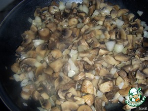 В раскалeнную сковороду налить растительное масло и добавить сливочное. Высыпать порезанные грибы и лук.