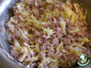 Сделать начинку: мелко нарезанную ветчину смешать с твердым сыром, натертым на крупной терке, майонезом и чесноком.