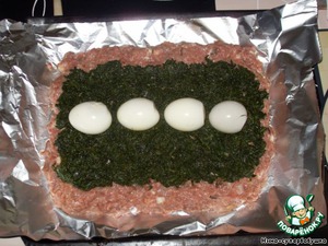 Фольгу смазать жиром, застелить пленкой. На пленке разложить полоски бекона, затем довольно толстым слоем выложить фарш. На фарш выложить шпинат.