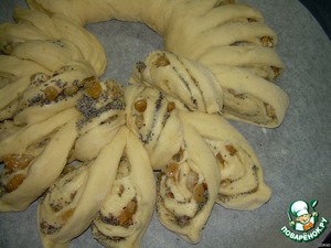 Дрожжи перетираем с мукой в мелкую крошку руками, все ингредиенты перемешиваем и вымешиваем мягкое тесто, которое отстаёт от рук. В конце замеса добавить цедру половинки лимона и ещё раз хорошо вымесить, чтобы равномерно цедра распределилась. Ставим в тёплое место на 1 час, затем выкладываем на стол, раскатываем аккуратно скалкой, присыпаем сахаром, снова пройдёмся скалкой, присыпаем маком, подсушенными измельчёнными грецкими орехами, распаренным, обсушенным изюмом, всё примнём немного ладошками. Сворачиваем тесто в рулет, концы рулета соединяем и защипываем.