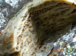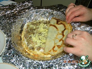 У нас уже готовы 2 начинки: это обжаренный фарш с лучком и грибочки с лучком. Майонезом рисуем сеточку. Чередуем начинки, посыпаем через блин сыром. Если сыра много, то можно и каждый. Накрываем фольгой и на 15 минут в горячую духовку. Сырок расплавиться и всё схватится :). Можно и чаёк ставить :)