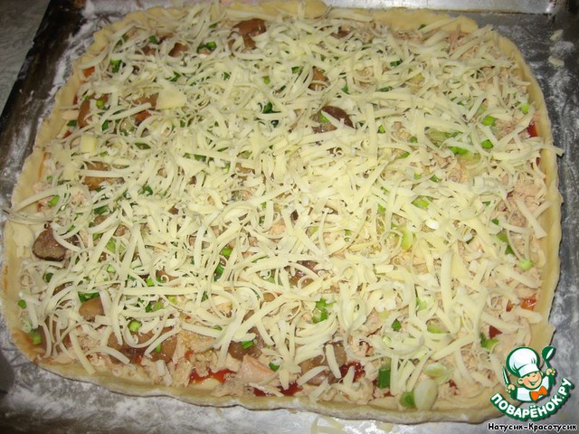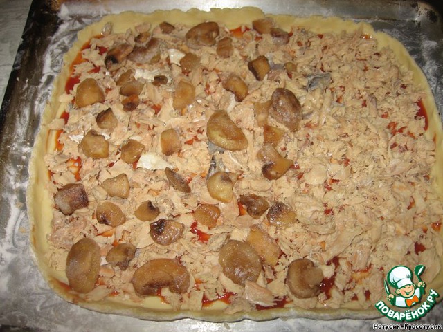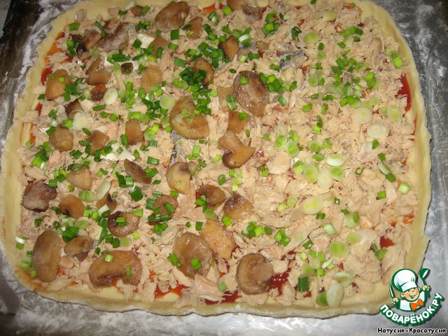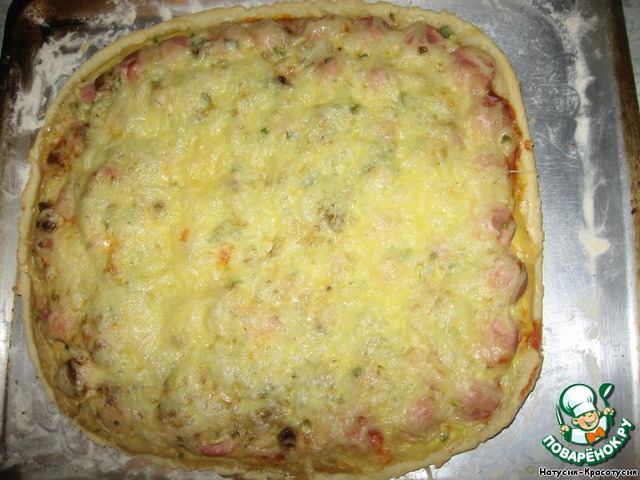 На сайте море пицц. Но такой я не увидела. Эту пиццу обычно готовит мой муж. За основу взят рецепт из книги Ляховской "Секреты домашнего кондитера" (1993 г. ). Получается быстро и очень вкусно. Вся наша семья и друзья очень любят эту пиццу. Это мой первый рецепт.
