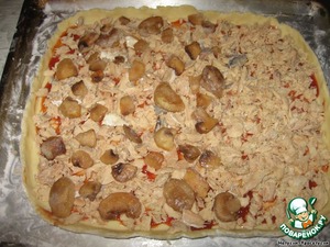 Сверху уложить грибы. Грибы могут быть любые. У нас обычно шампиньоны консервированные или замороженные.