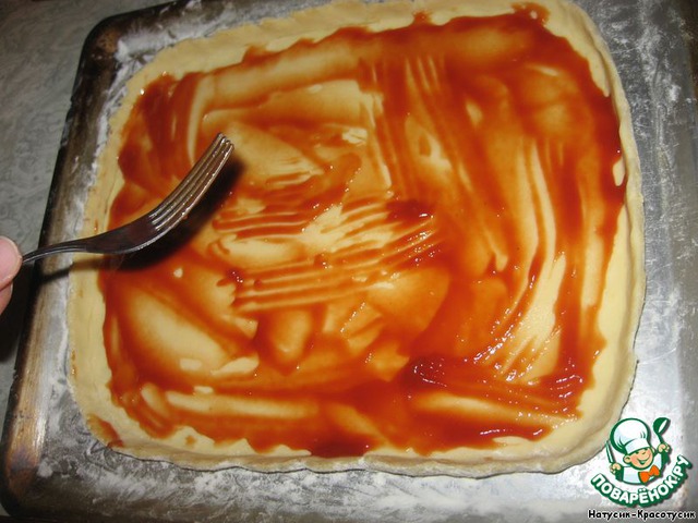 Смазать кетчупом. Вместо кетчупа можно положить тонко порезанные помидоры. (Получается намного сочнее и вкуснее, но сейчас не сезон).