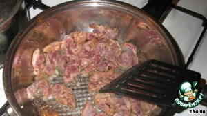 Печень обваливаем в муке. Обжариваем на предварительно разогретой с маслом сковороде минут пять. И перекладываем в кастрюлю, убавляя огонь до минимума.
