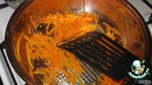 На сковороде, где жарилась печень обжариваем морковь минуты три на среднем огне.