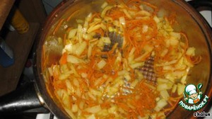Добавляем к морковке лук и обжариваем еще минут пять. Накрываем крышкой, убавляем огонь и томим минуты 3.