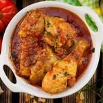 Добавить помидоры в собственном соку и томат-пасту, бульон от курицы и тушить на медленном огне минут 20-25 под закрытой крышкой. Если жидкости маловато, то совсем немного добавить кипятка.
