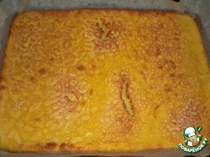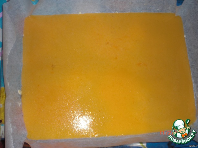 • Pазмешиваем сок, муку, цедру, добавляем яйца, взбиваем на маленькой скорости до растворения сахара, но избегать образования пены, добавить растопленное масло, тщательно размешать и вылить на противень, покрытый бумагой, смазанной маслом.