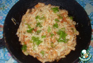 В это время откидываю макароны на дуршлаг, протираю сыр на мелкой терке и режу укроп.